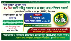 রাউজান ইসলামিক মডেল স্কুল (RIMS) প্রধান শাখার পরিচালনায় পবিত্র রমজানুল মোবারক মাসে ২১ দিনব্যাপী সহিহ কোরআন তিলাওয়াত ও হামদ-নাত প্রশিক্ষণ কোর্সে ভর্তি কার্যক্রম শুরু হয়েছে। রাউজান ইসলামিক মডেল স্কুলের মিলনায়তনে এ প্রশিক্ষণ কোর্সটি অনুষ্ঠিত হবে।